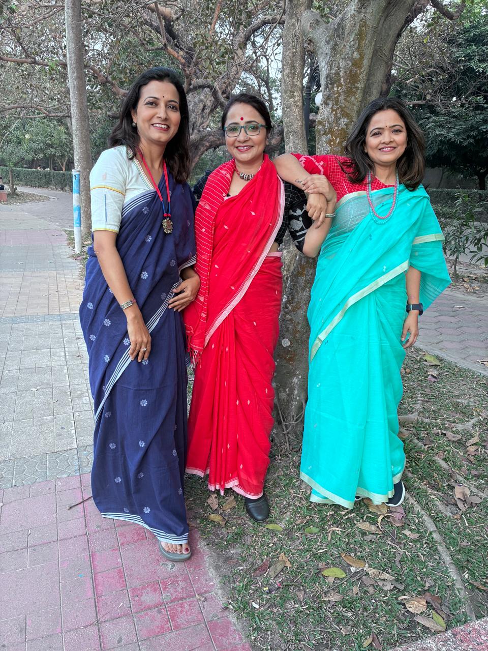 - The model is styled with a white Jamdani blouse for contrast and contemporary appeal.