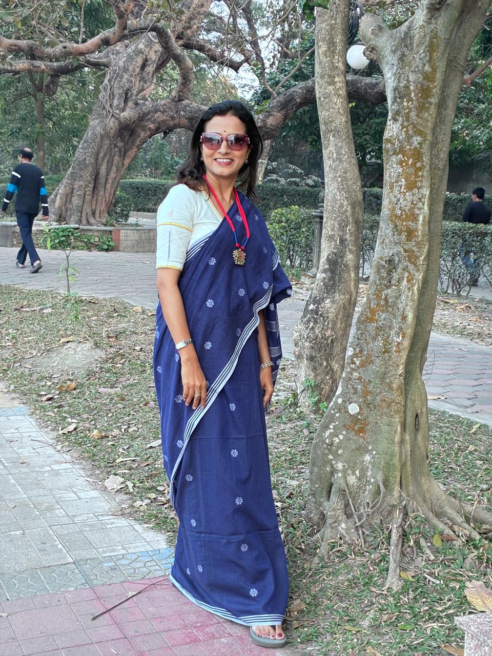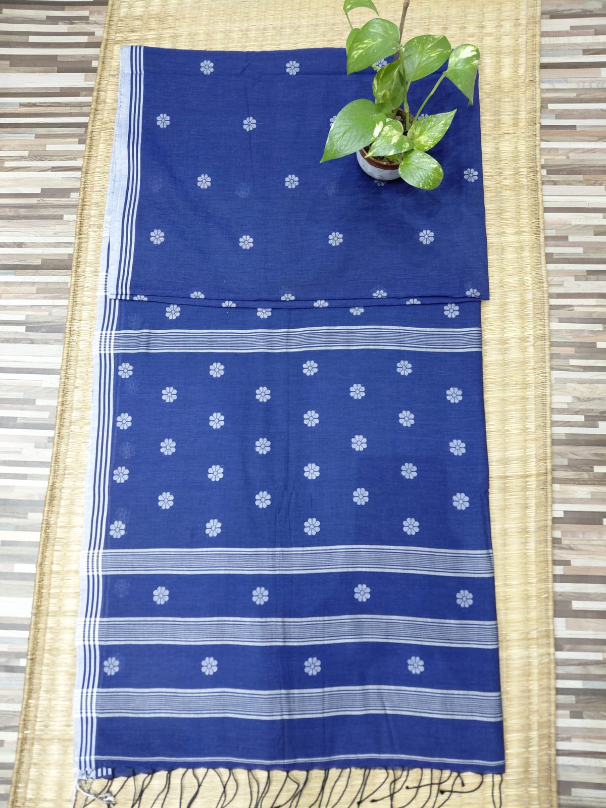 Handwoven cotton saree with jamdani buta all over saree. Blue Body with floral buta all over the body.