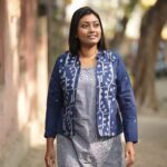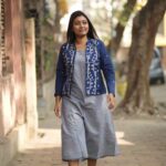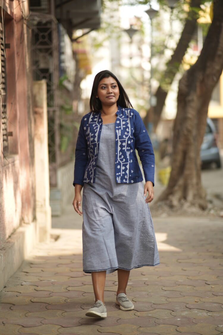 This handwoven Blue border jamdani dress has a noodle strap tunic and a seperate jacket. This tunic comes with a right side pocket. The jacket comes with cotton lining.