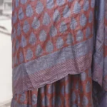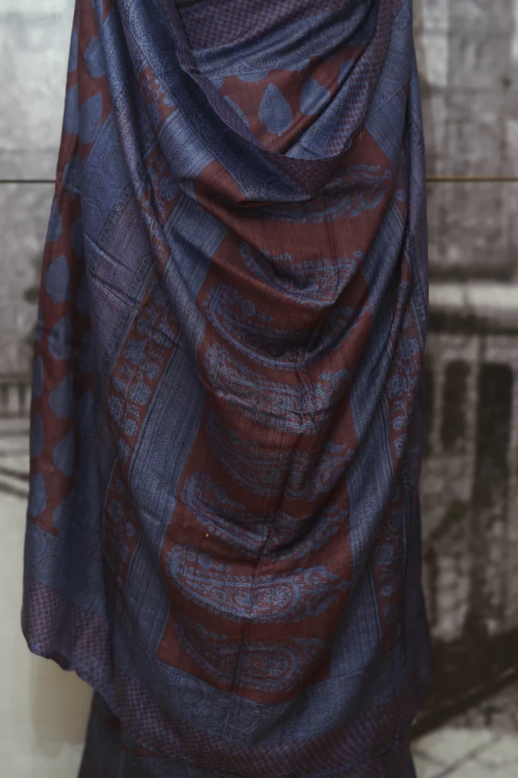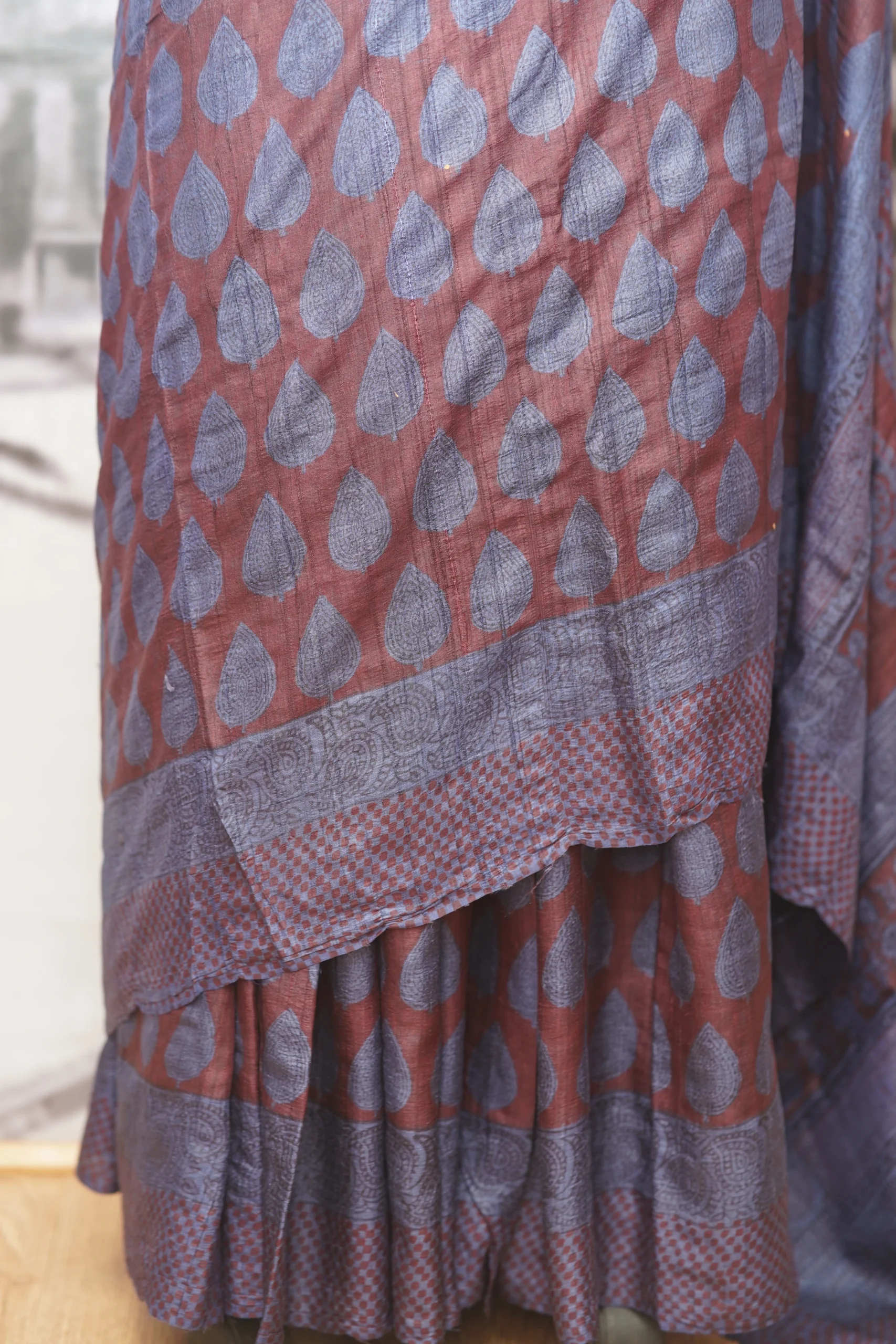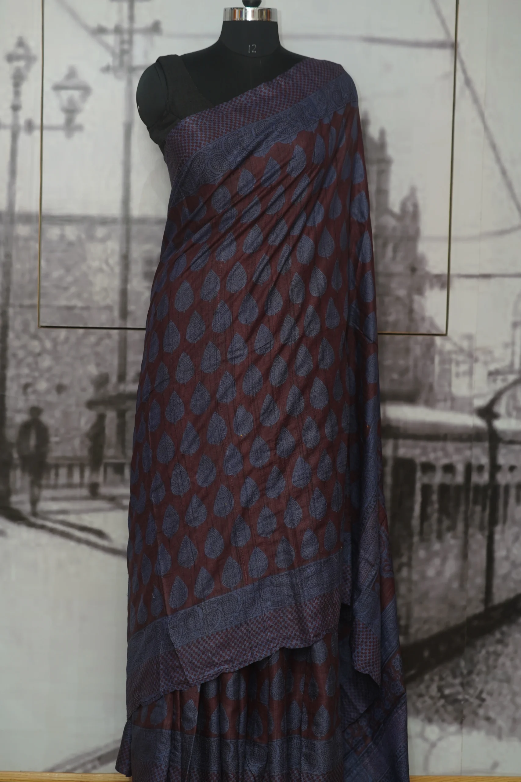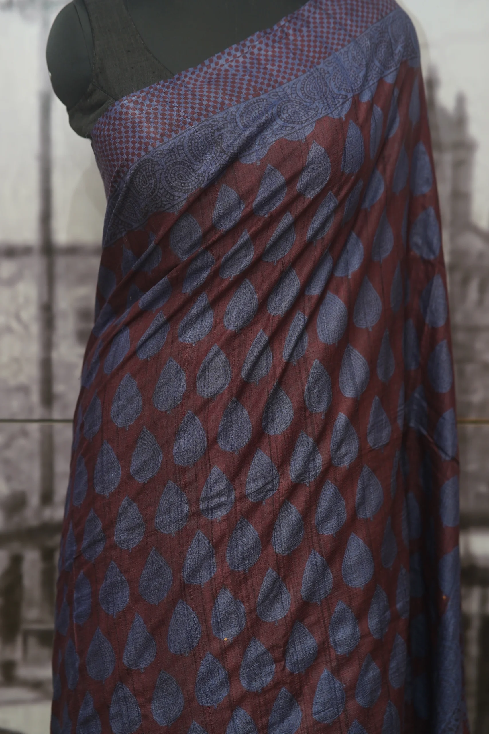 Elevate your wardrobe with this exquisite Bagh Hand–Block printed Tasar Saree, a masterpiece that blends tradition and elegance. Bagh is a traditional hand-block print practised by skilled artisans of Dhar district in Madhyapradesh. Bagh printing is done using natural colours that are mined from fruits and flower extracts.