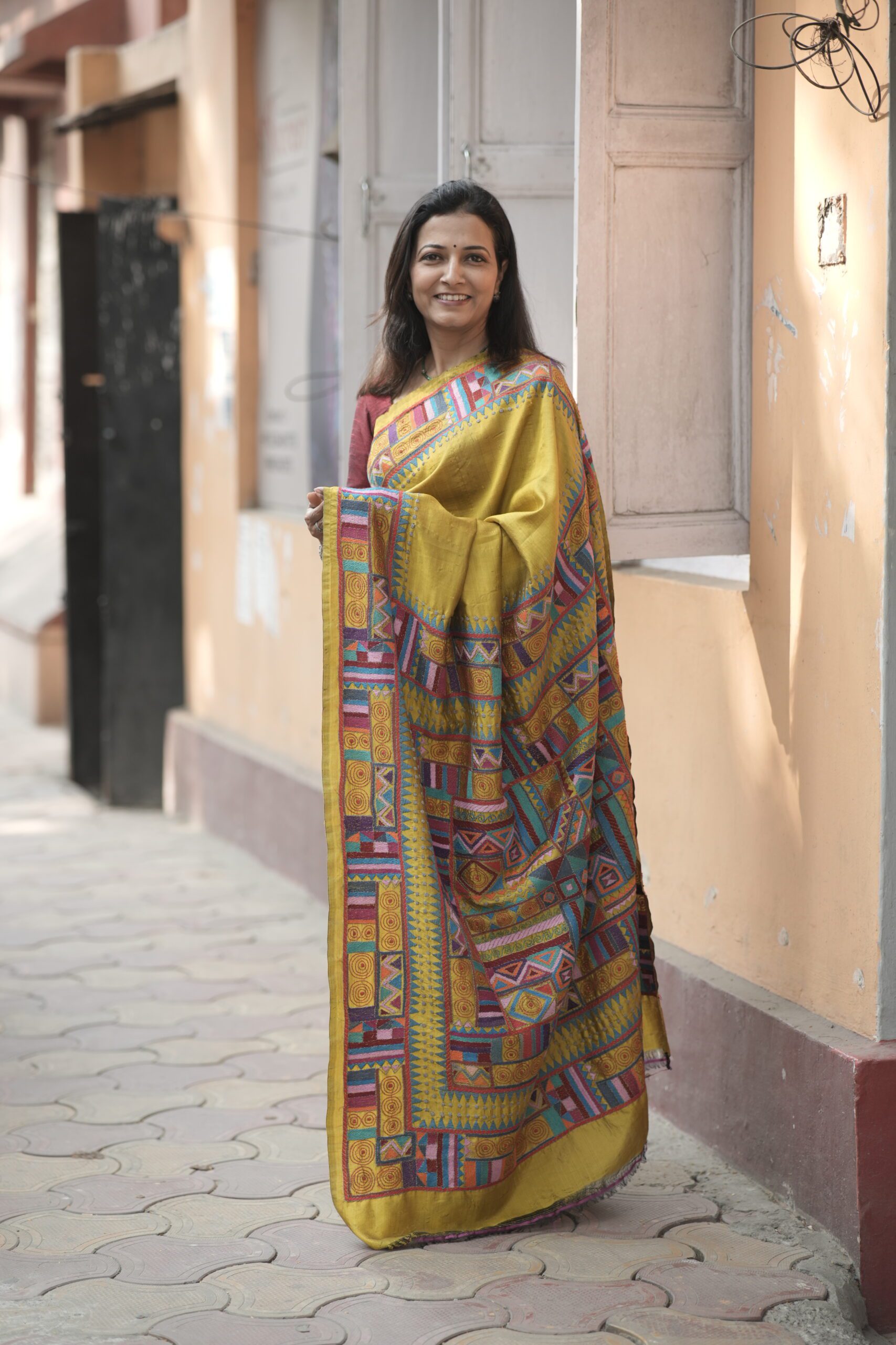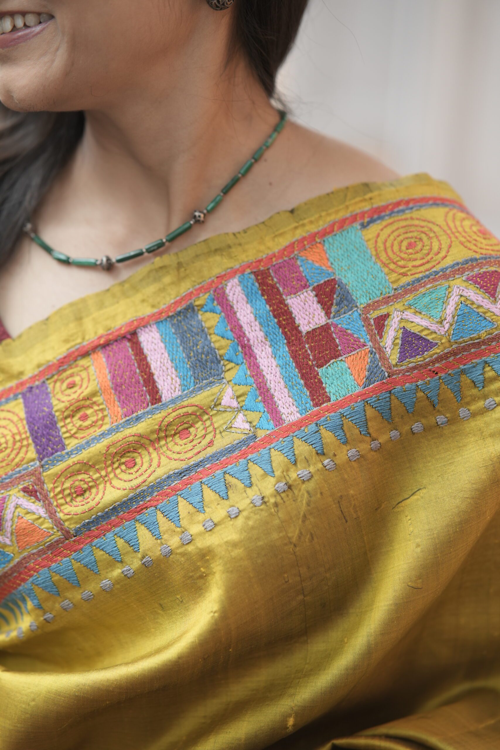 Each Kantha stitch is placed by hand, making the saree a true labour of time, skill, and patience. The geometric patterns bring a contemporary edge, while the Kantha embroidery keeps it deeply rooted in tradition. This saree is perfect for festive occasions,