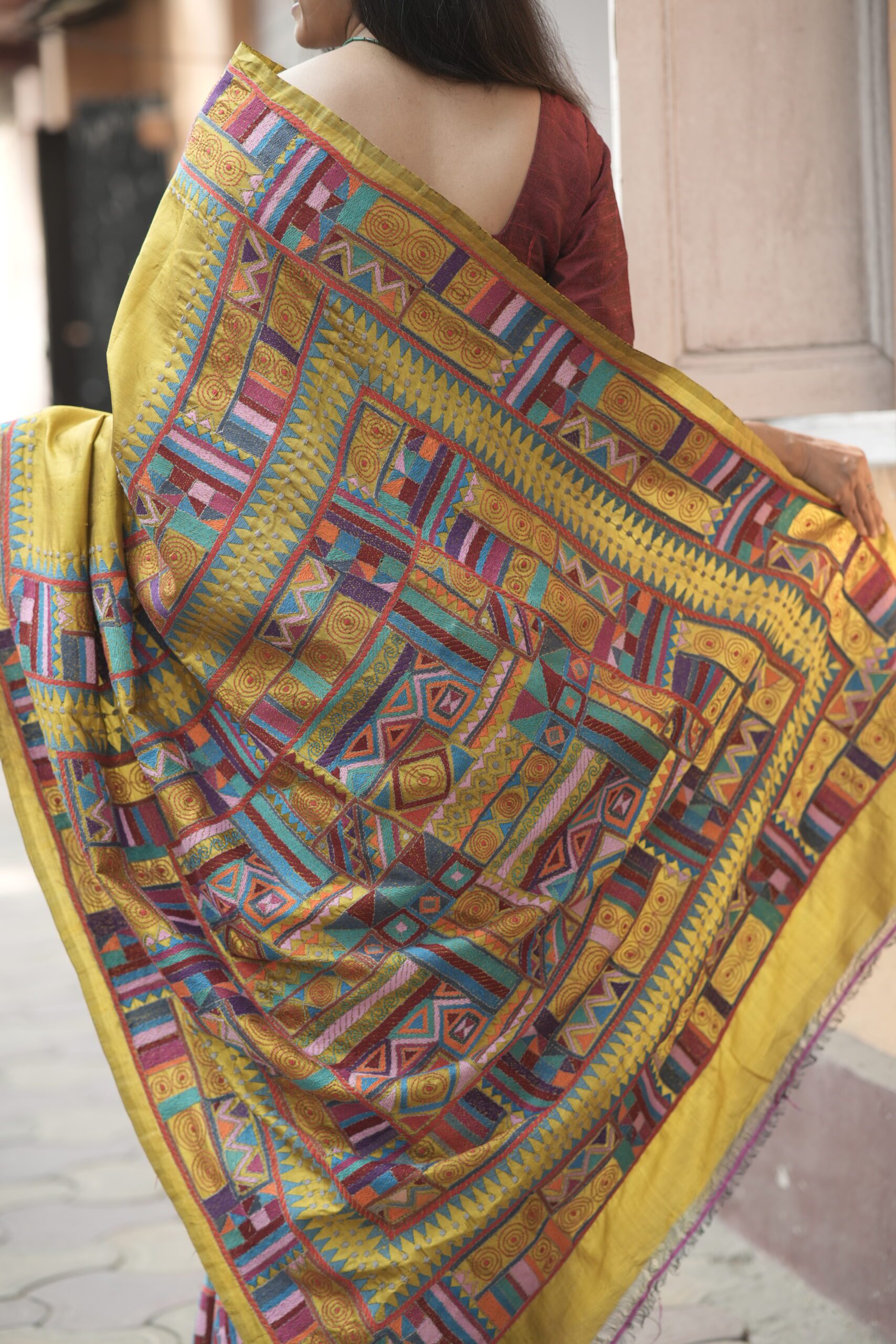Bold, vibrant, and rich in craftsmanship, this Chrome Yellow Hand Kantha Embroidered Saree is a striking celebration of colour and hand artistry. Crafted on a bright chrome yellow base, the saree features multicolour geometric motifs, meticulously hand embroidered using traditional Kantha stitch, creating depth, texture, and visual rhythm across the drape.