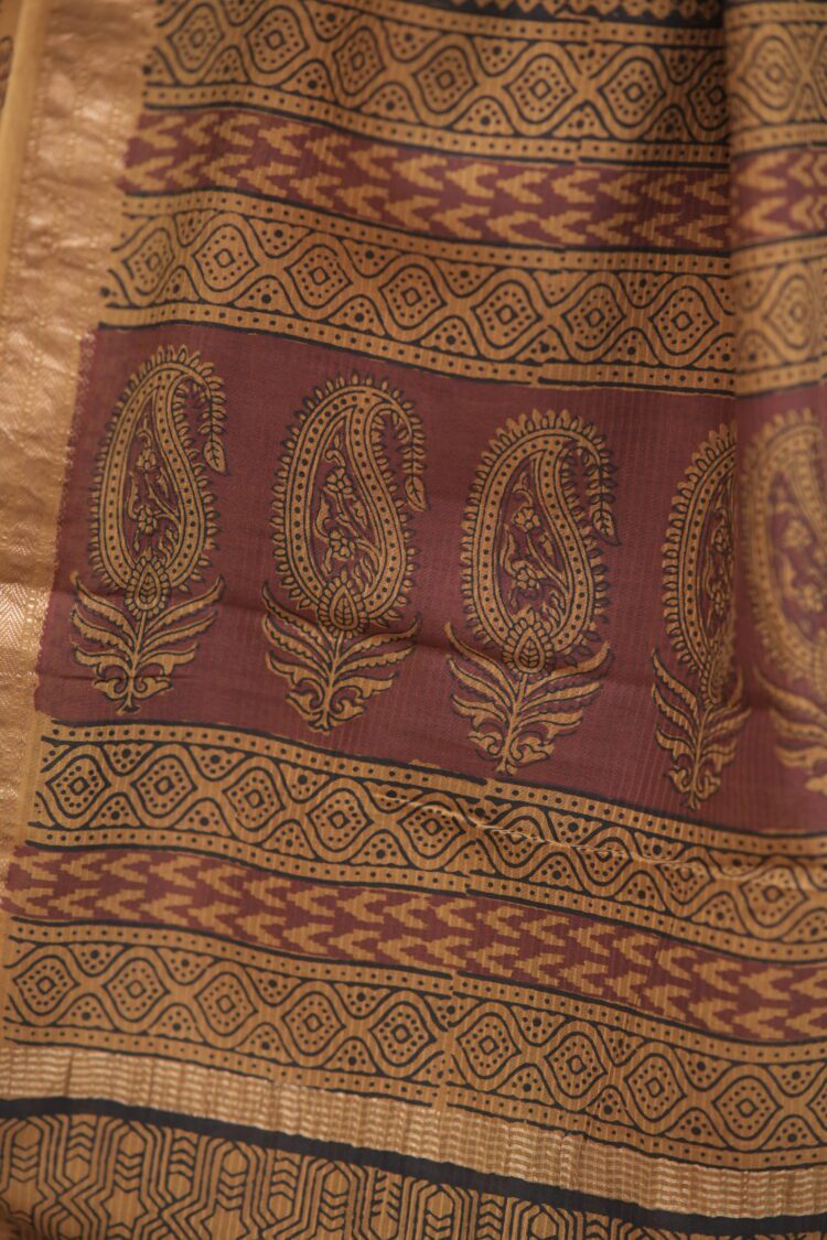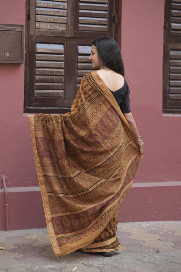 This Yellow Chrome Yellow with Maroon flower Maheshwari Bagh Hand Block Printed Saree brings together the graceful drape of Maheshwari fabric with the beauty of Bagh hand block printing from Madhya Pradesh.