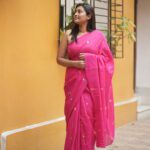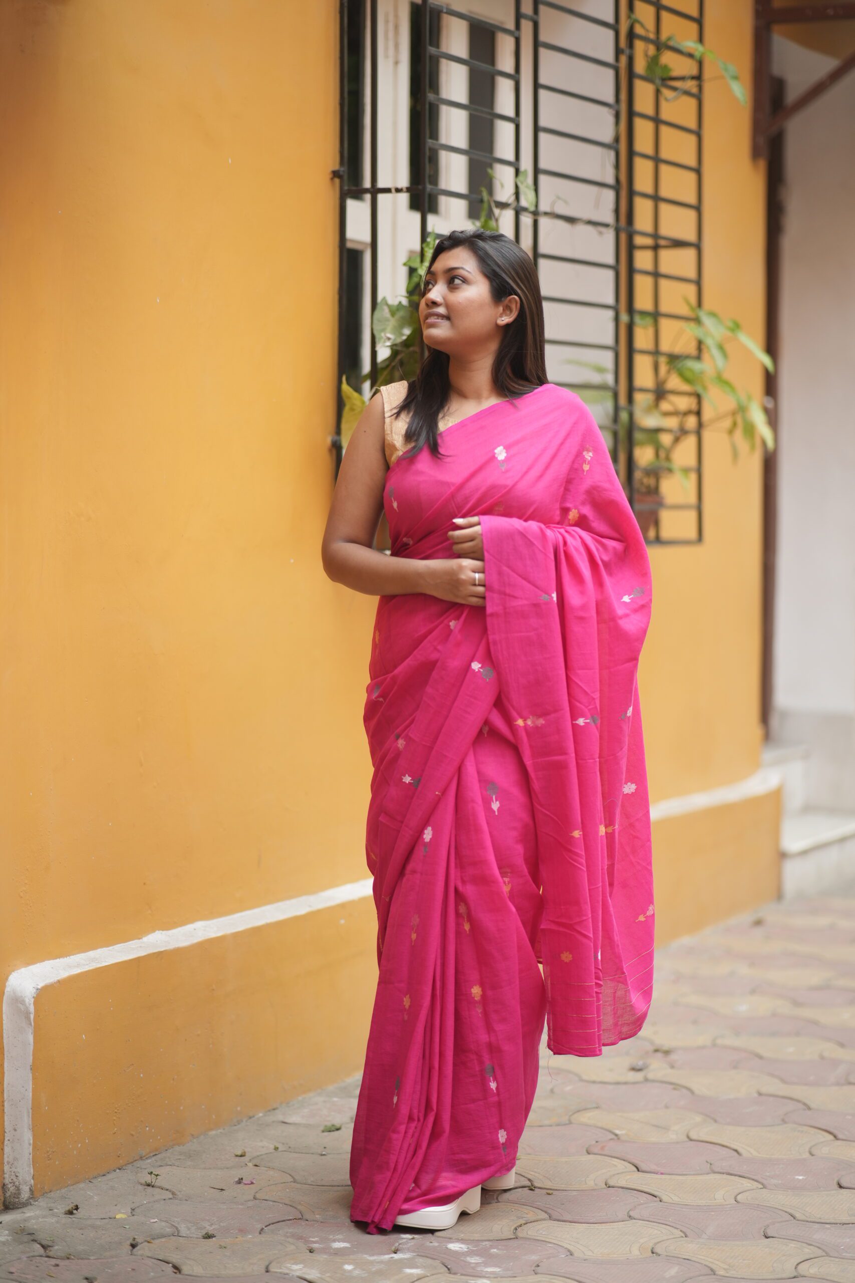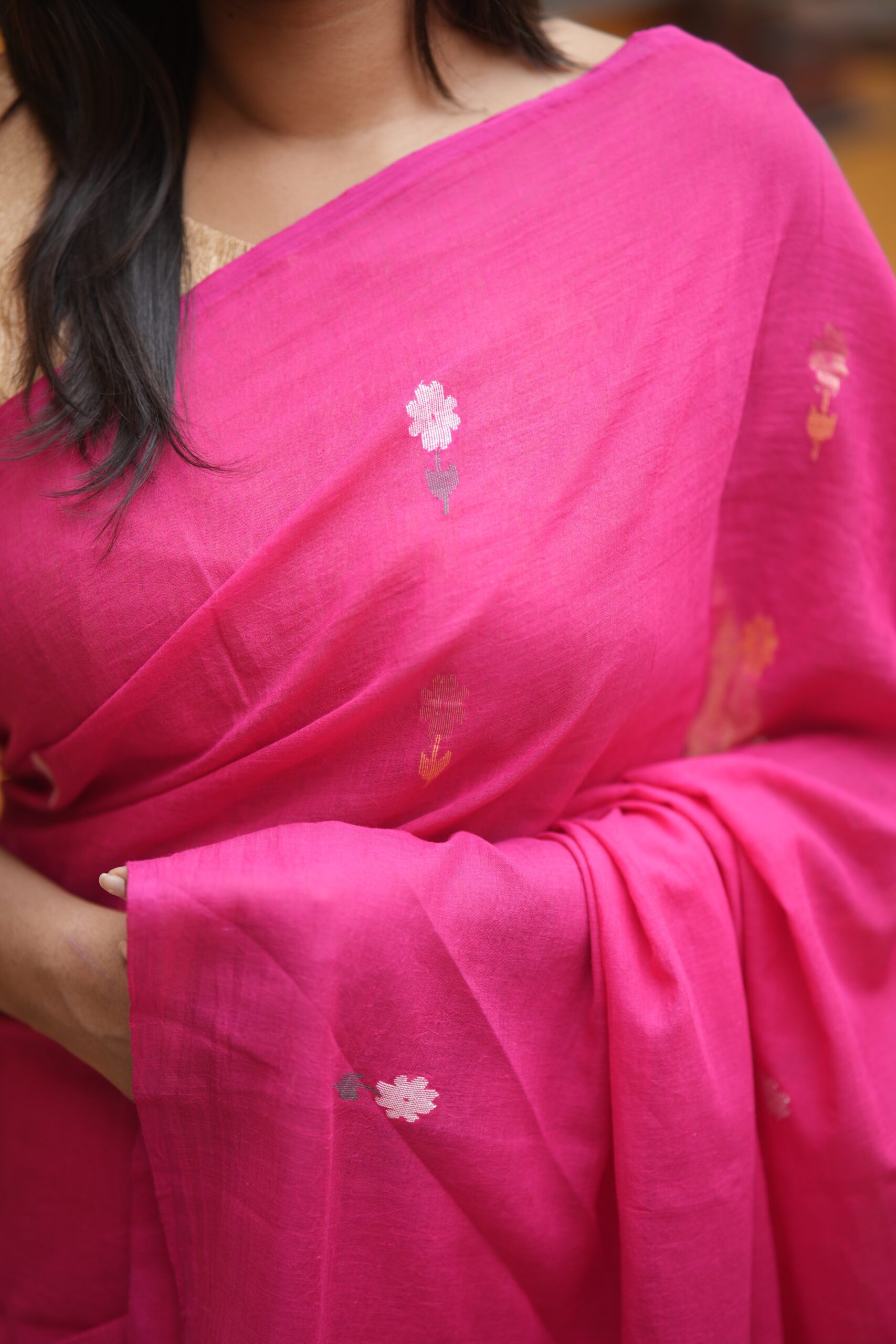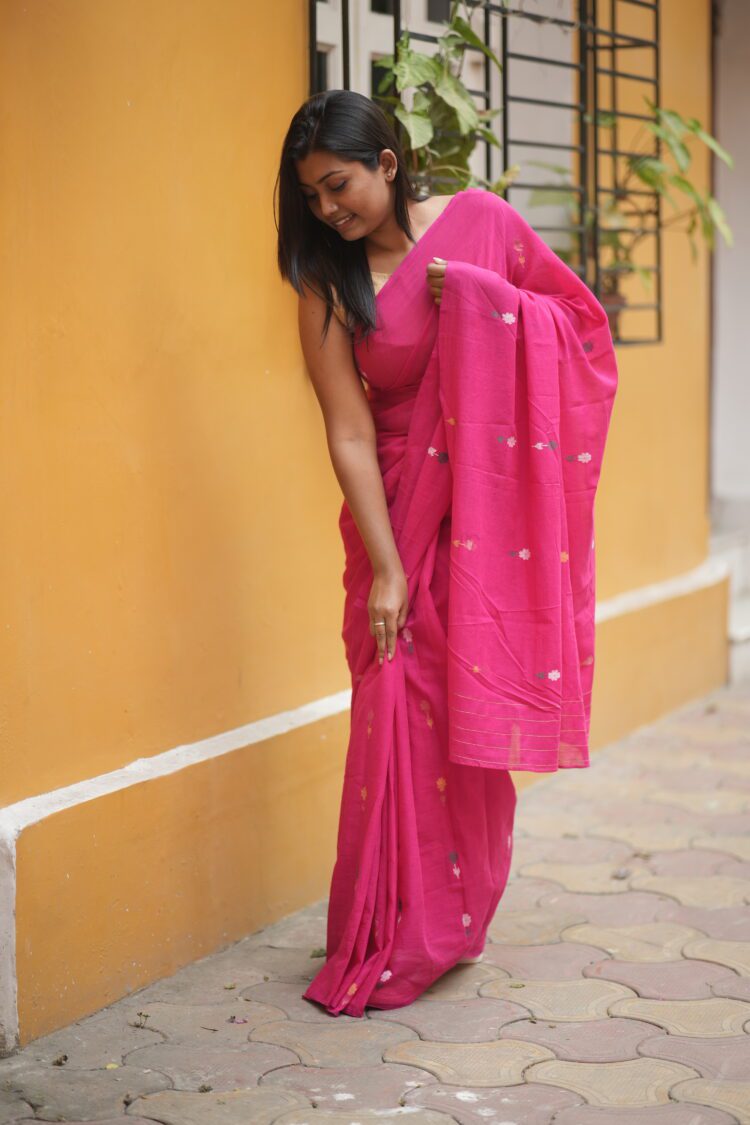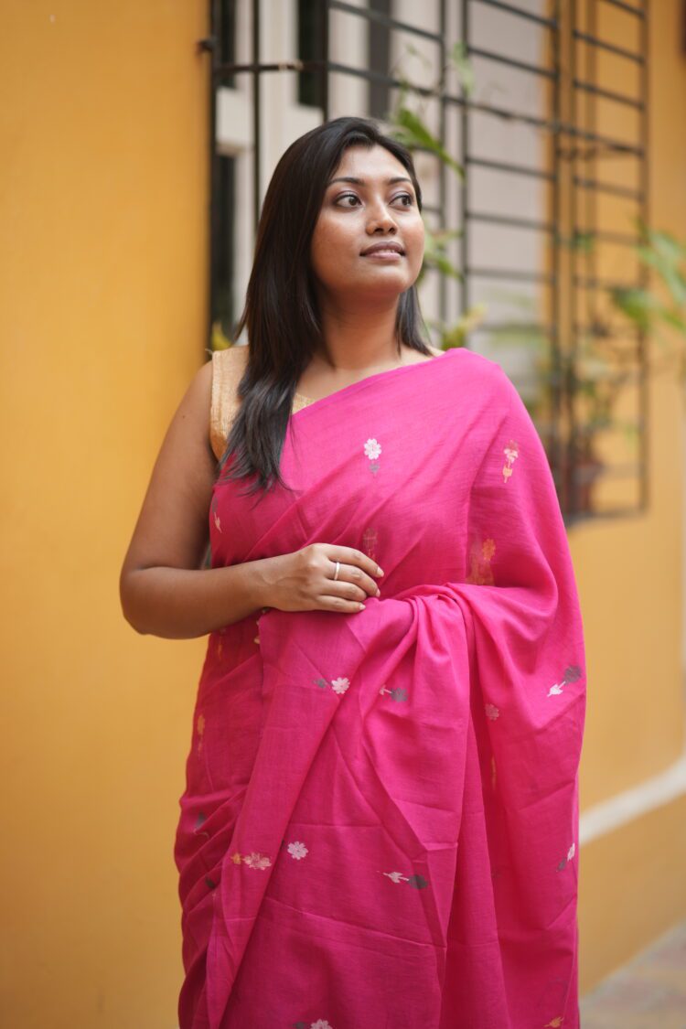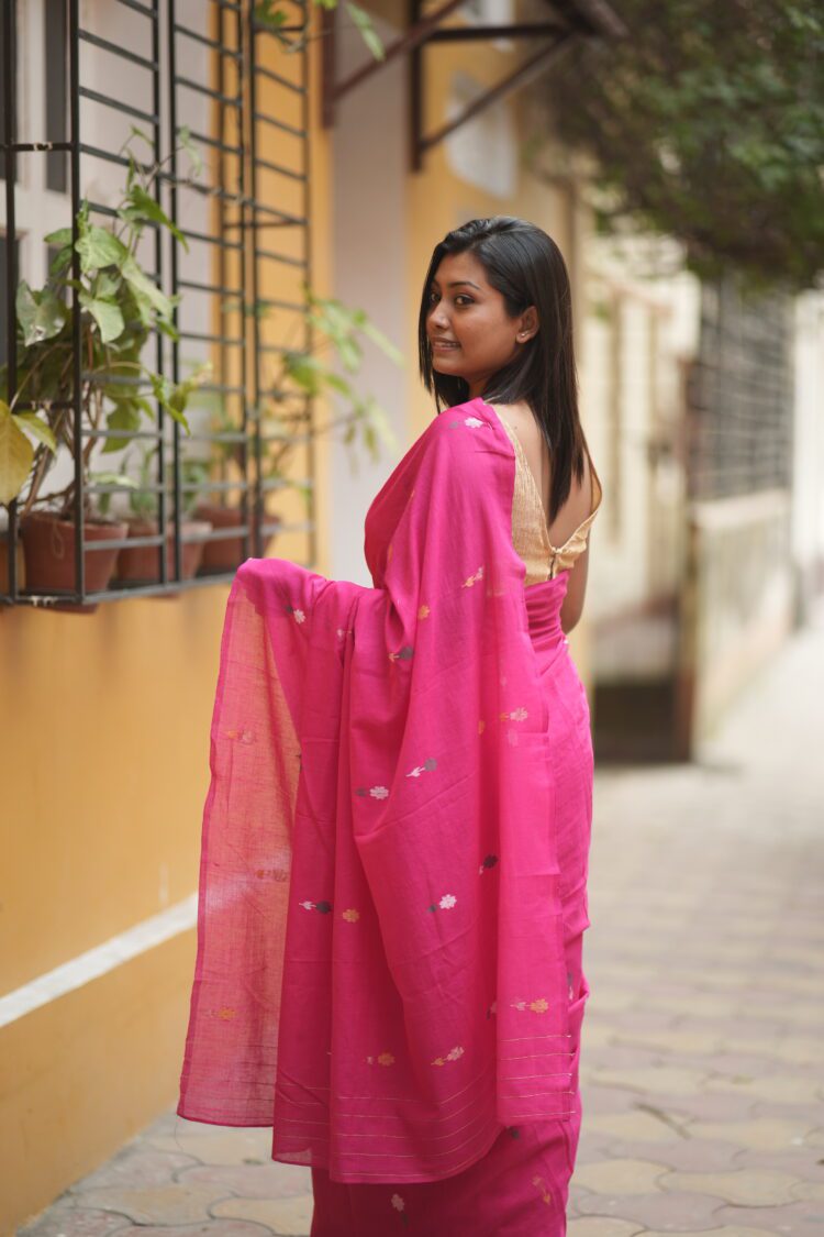 Fuchsia Pink Jamdani Saree with Golden Floral Buta