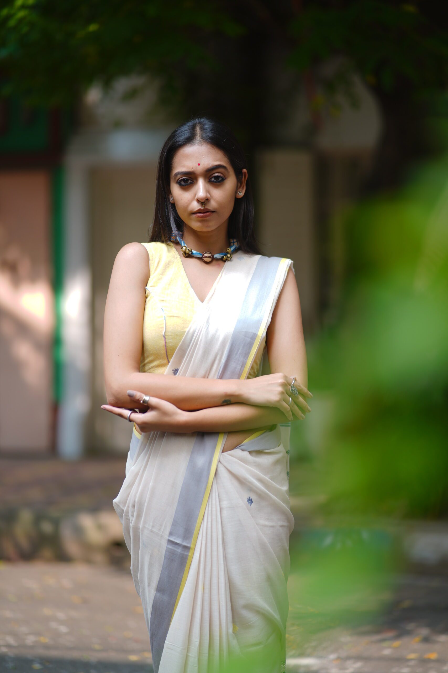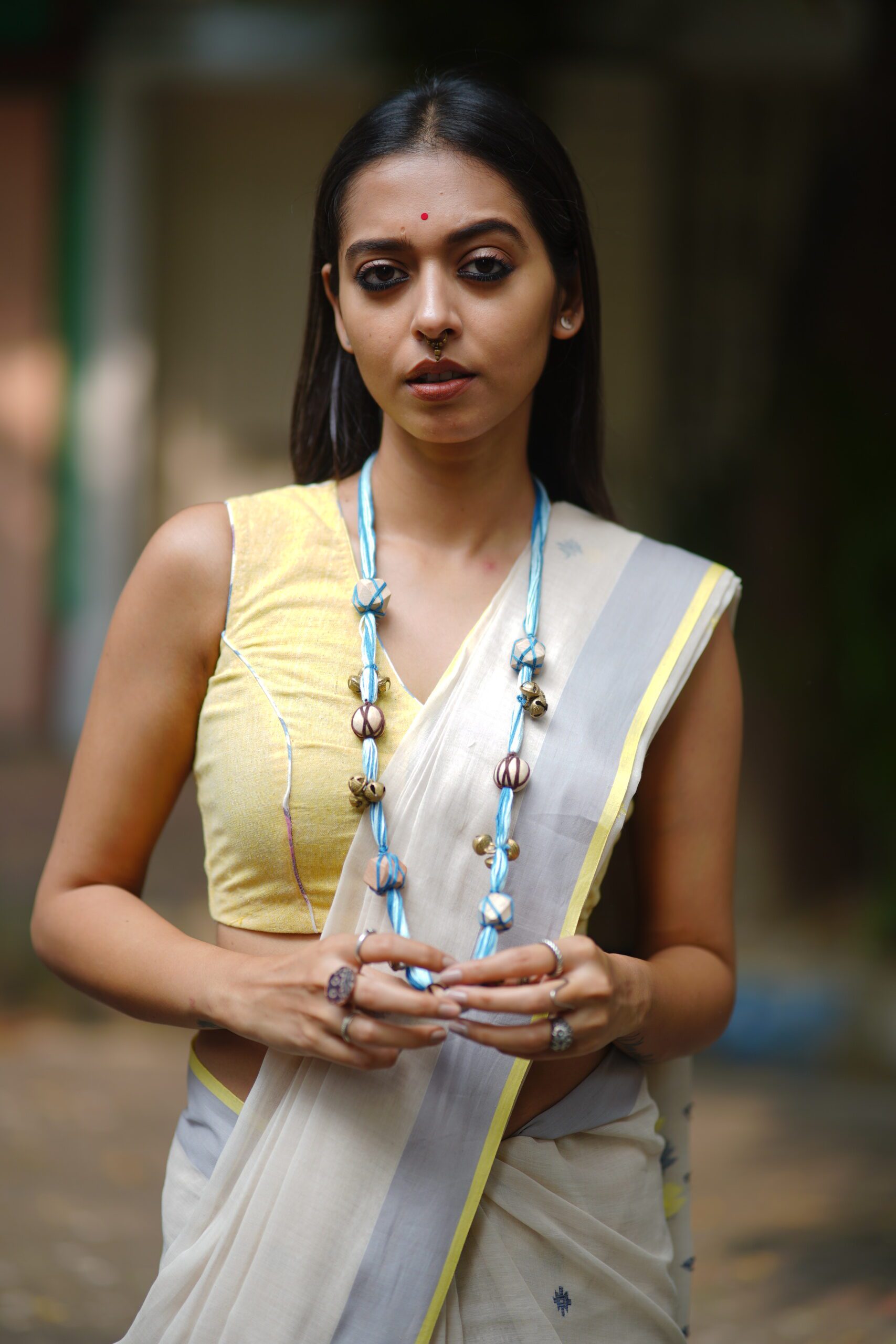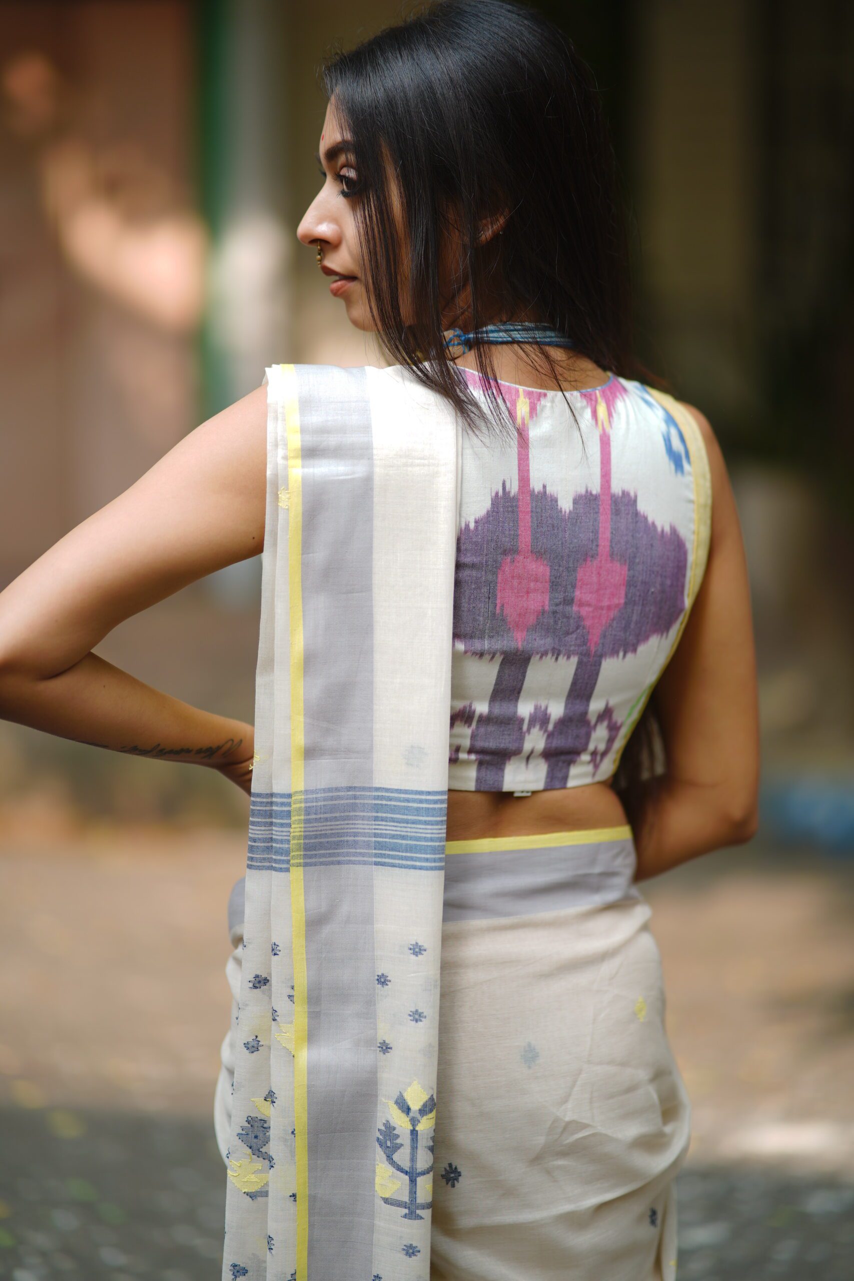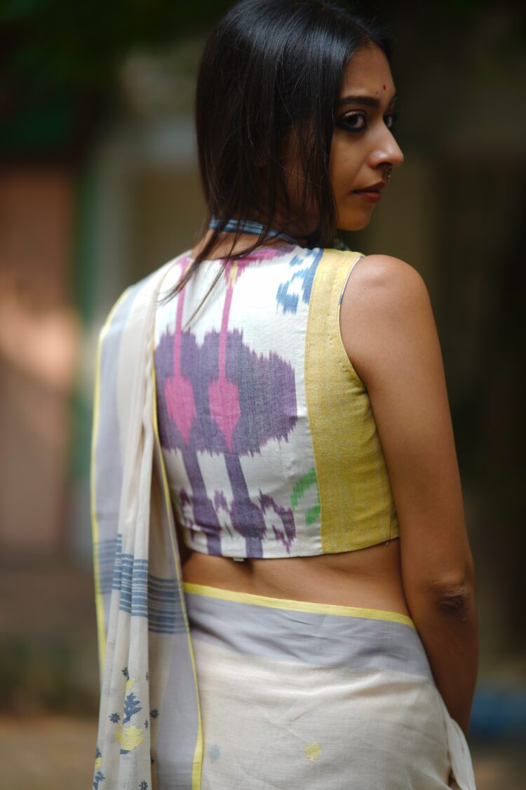 A unique blend of global artistry and Indian tradition, this blouse features a striking Indonesian Ikat at the centre, beautifully complemented by handwoven Kotpad fabric.