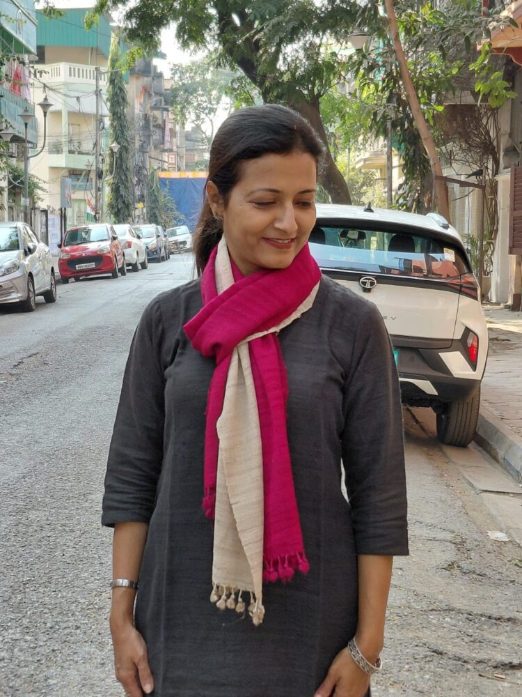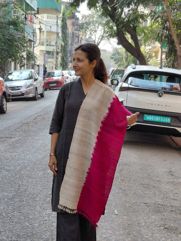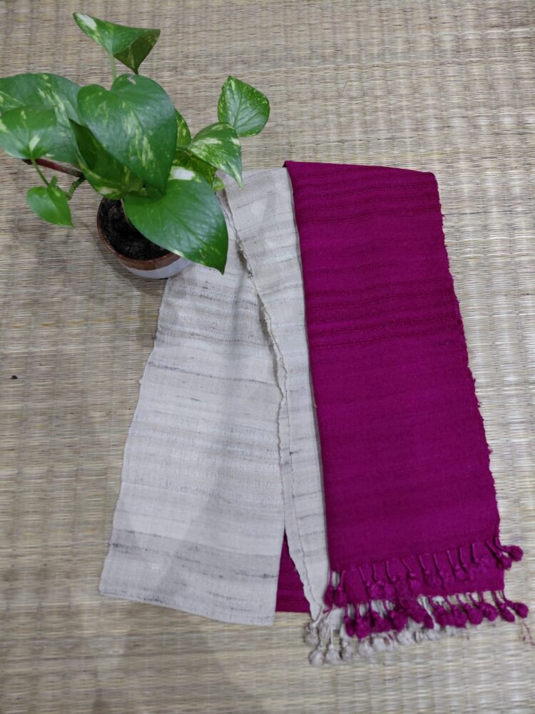 This hand-loomed Tasar silk stole features a minimalist natural body contrasted by a bold, saturated pink-magenta panel. Finished with hand-tied tassels, it’s a versatile accessory designed for the woman who loves understated luxury with a twist of colour. This stole is a testament to slow fashion and Indian craftmanship.