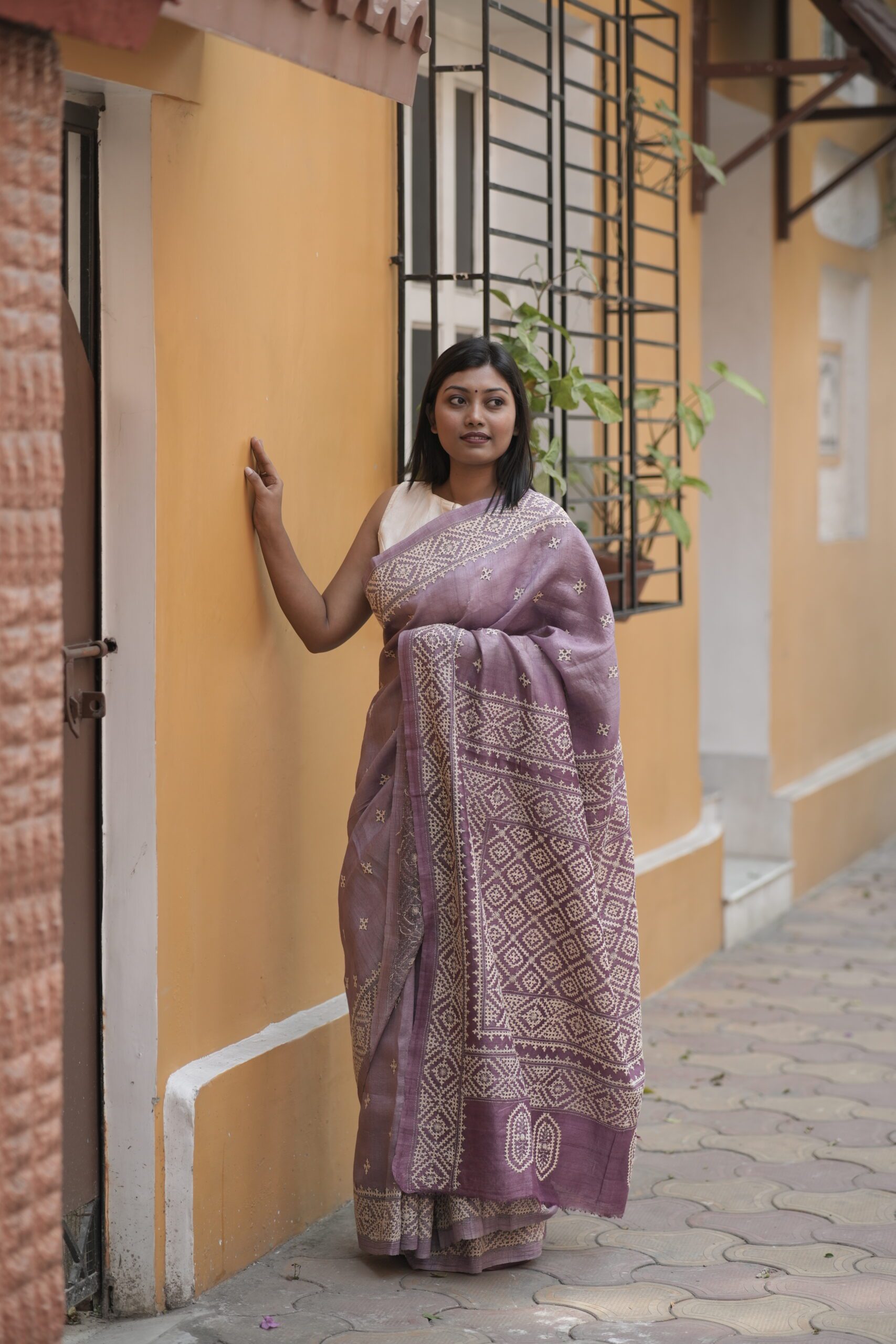 Elegant and understated, this Mauve Shade Dye Tussar Saree celebrates handcrafted detail and natural texture. Woven in rich tussar silk, the saree features beige Gujarati hand embroidery that adds depth, contrast, and artisanal charm.