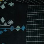 Black Handloom jamdani fabric from Bengal. Delicate thin cotton fabric. Allover checks body with blue and white jamdani weave floral motif.