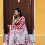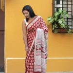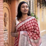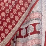 Step into effortless elegance with this Bagh print modal silk saree, featuring a deep red base adorned with classic white floral motifs — a stunning blend of bold tradition and feminine grace. The finely printed pallu enhances its artisanal charm, making it a perfect choice for festive gatherings, intimate celebrations, or evening soirees.