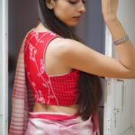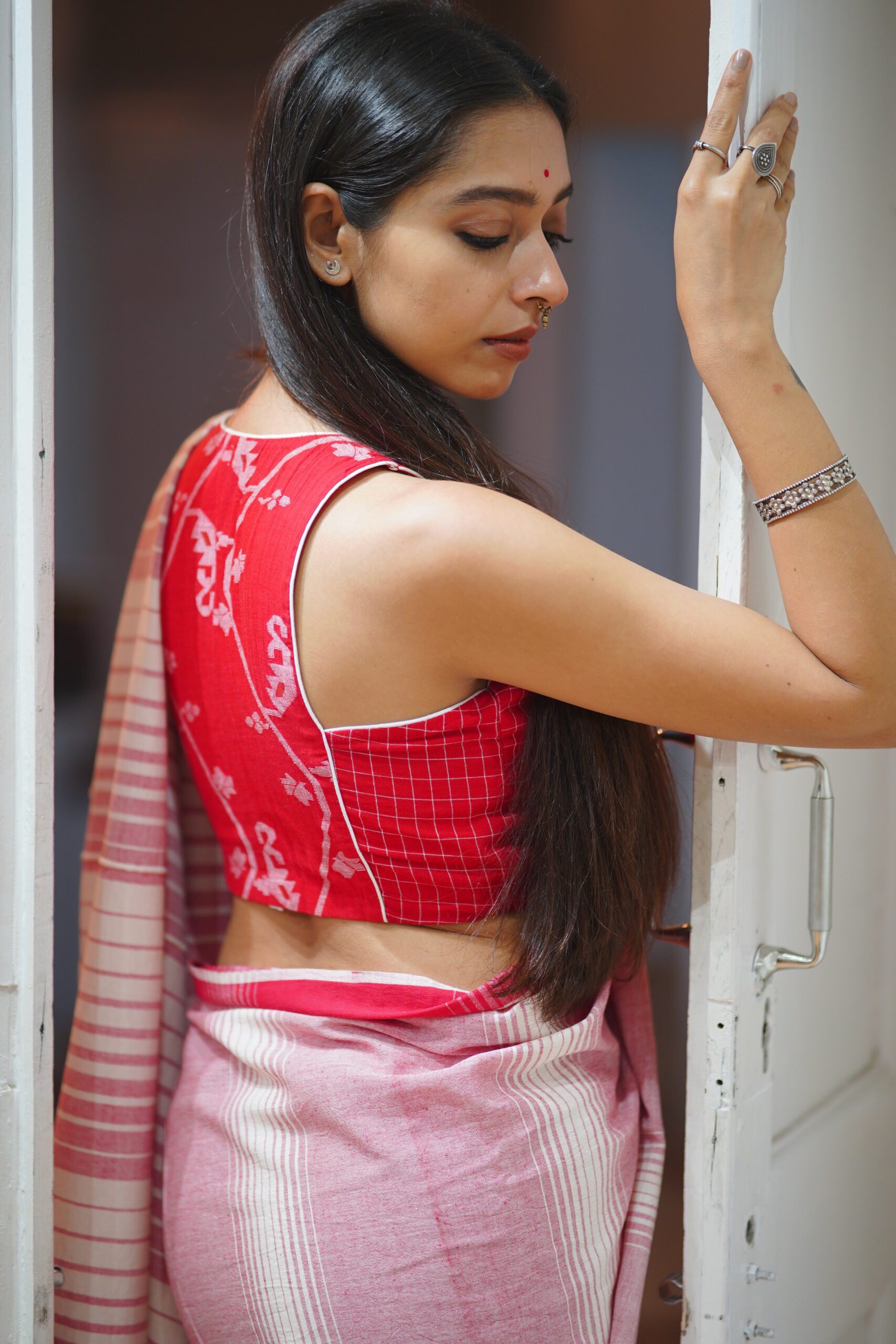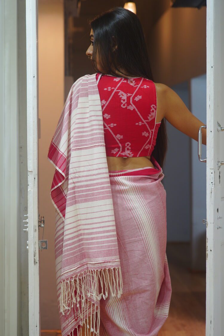 • Colour: Red with woven Jamdani motifs