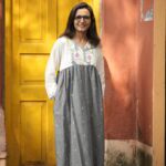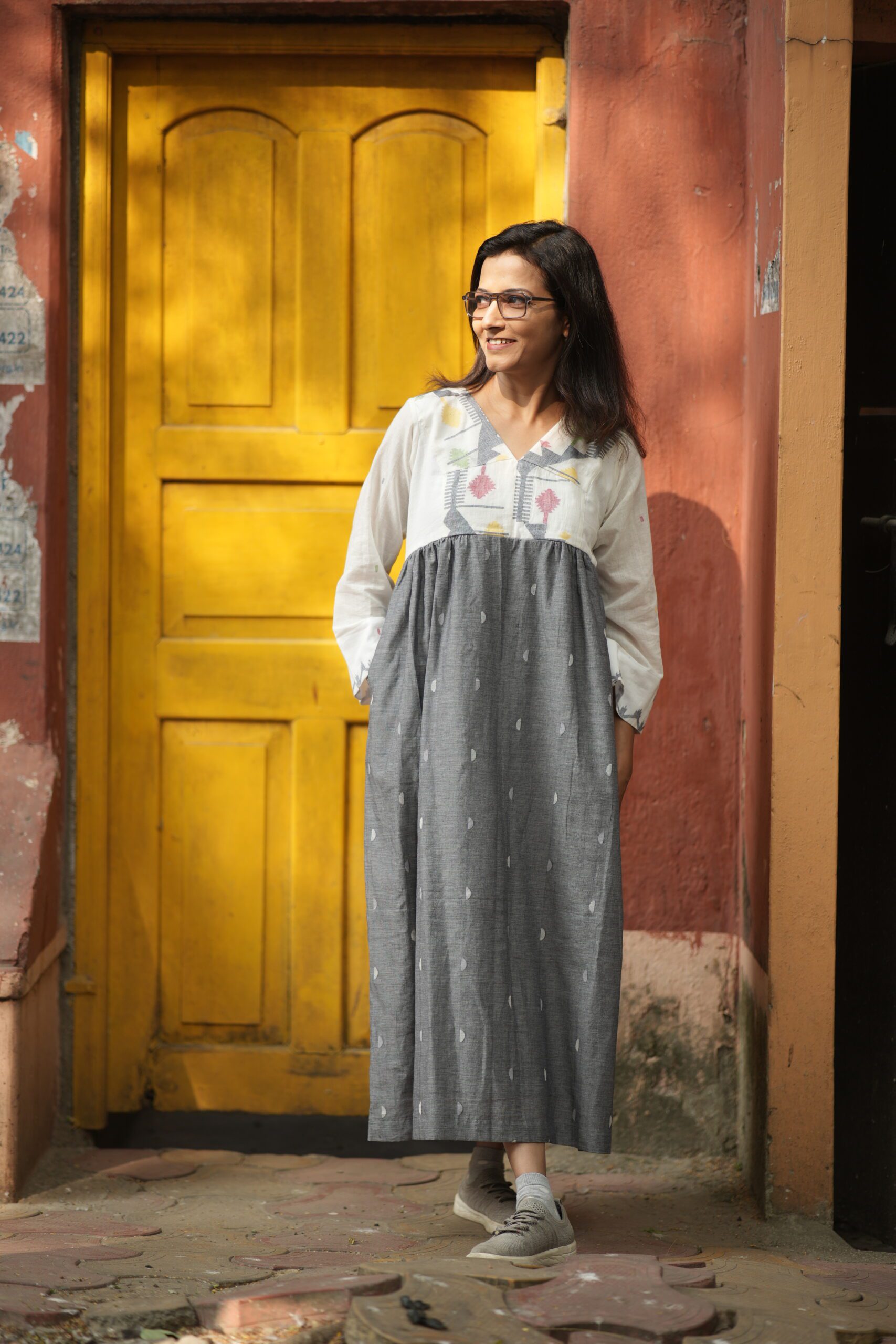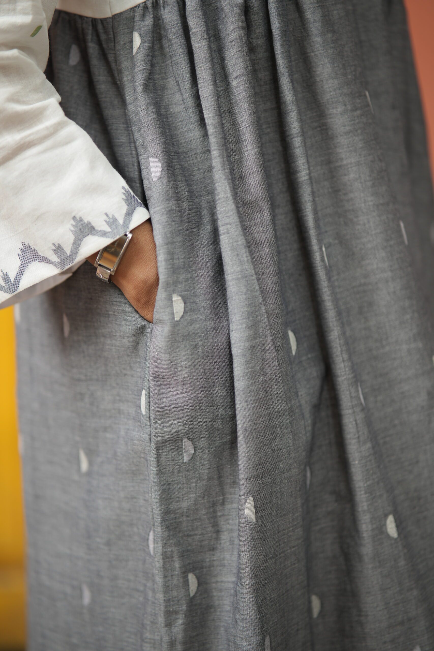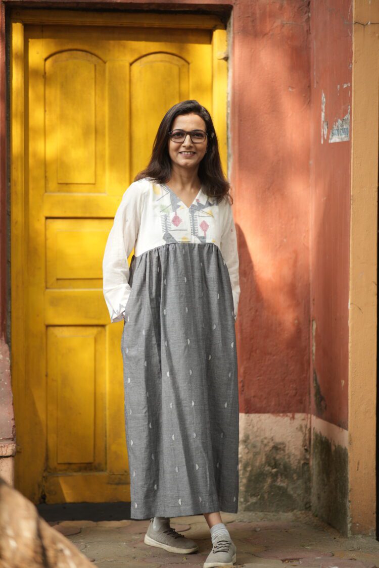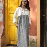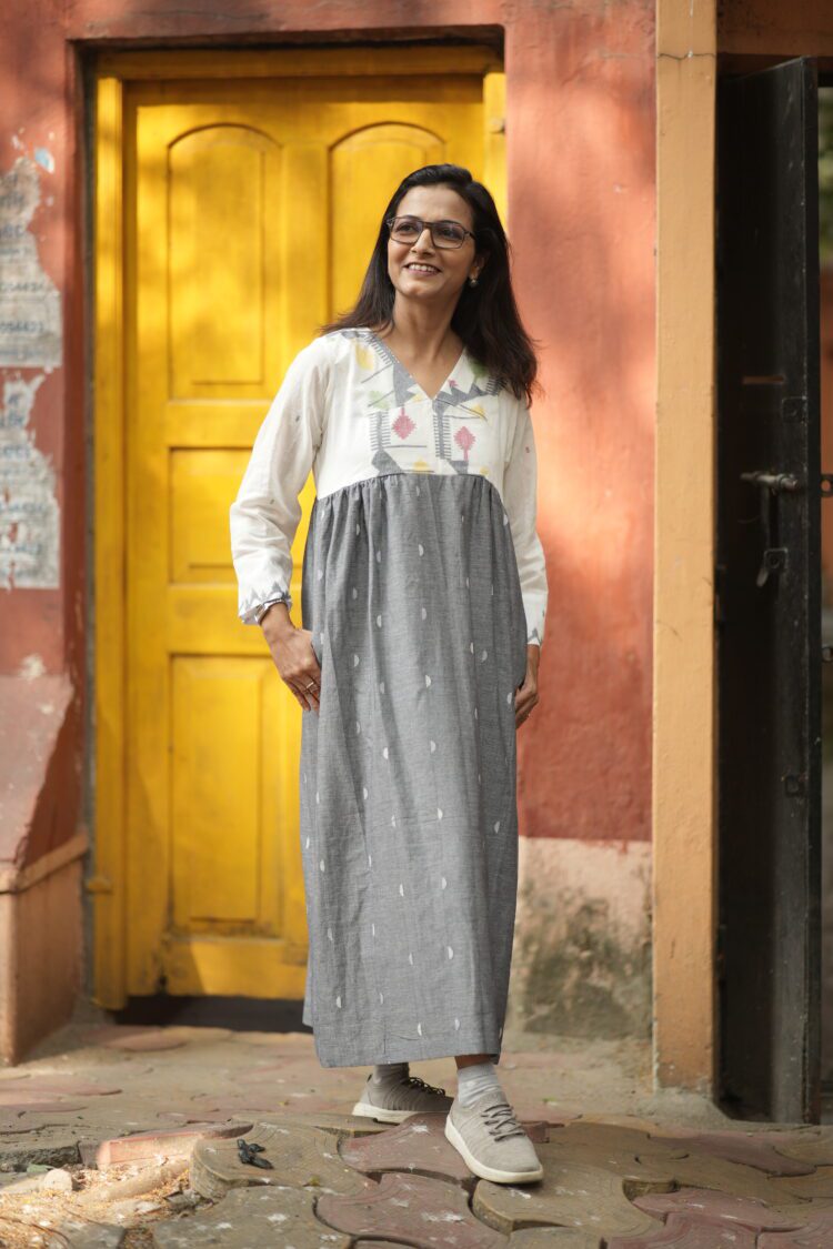 Jamdani border woven on white luxurious cotton paired up with grey buta jamdani. The yoke and hand highlights the traditional border jamdani . The calf-length dress ( 47 inches) features long, loose sleeves. It comes with both side pocket and attached cotton lining.