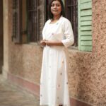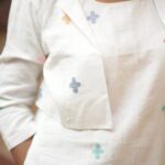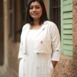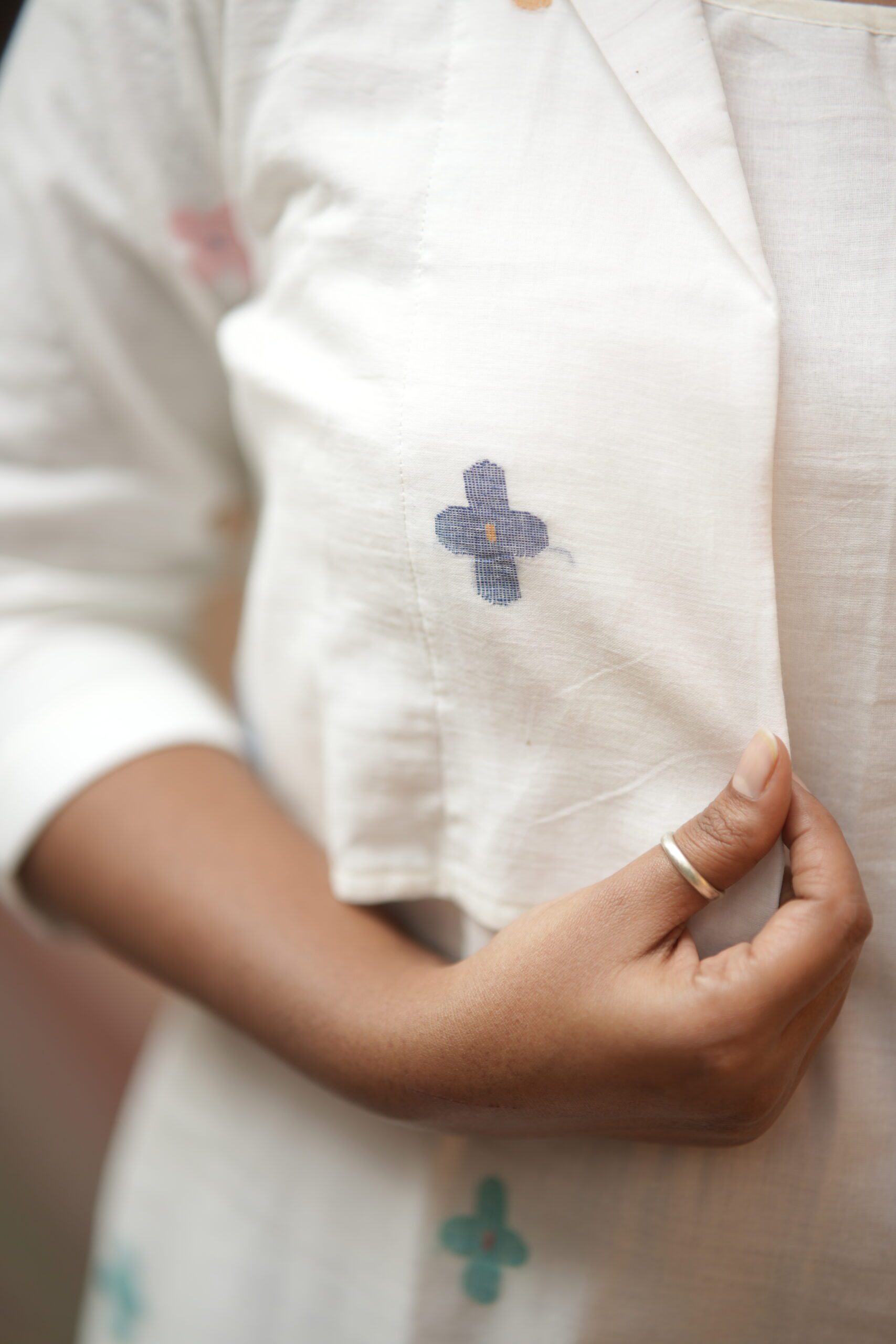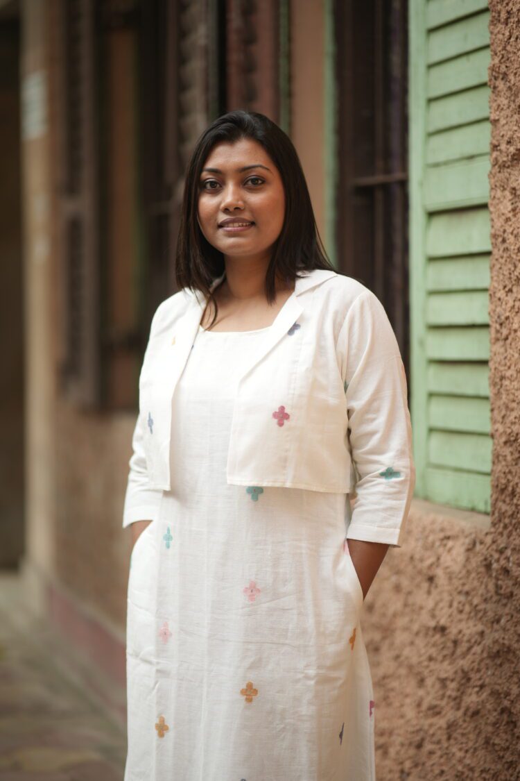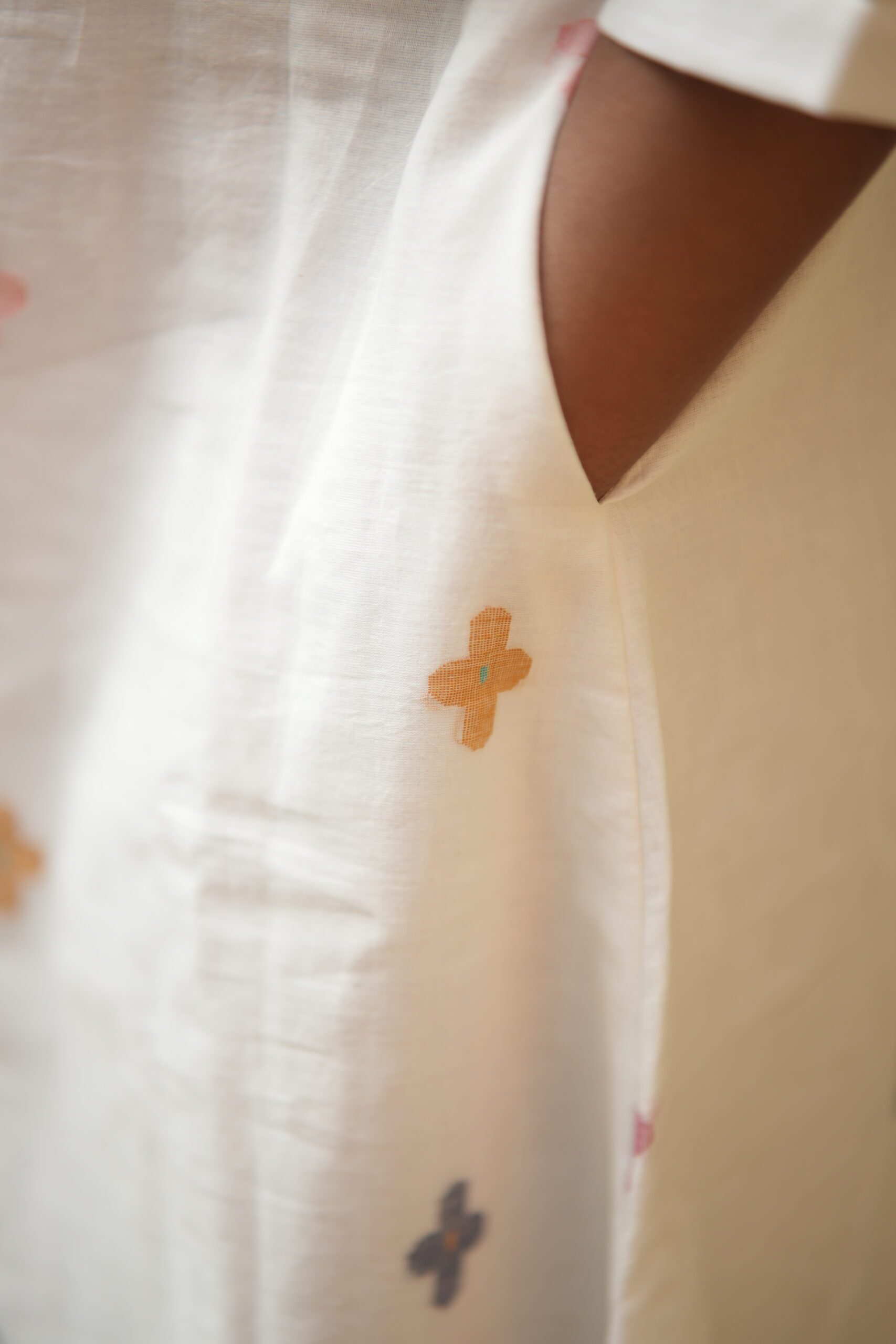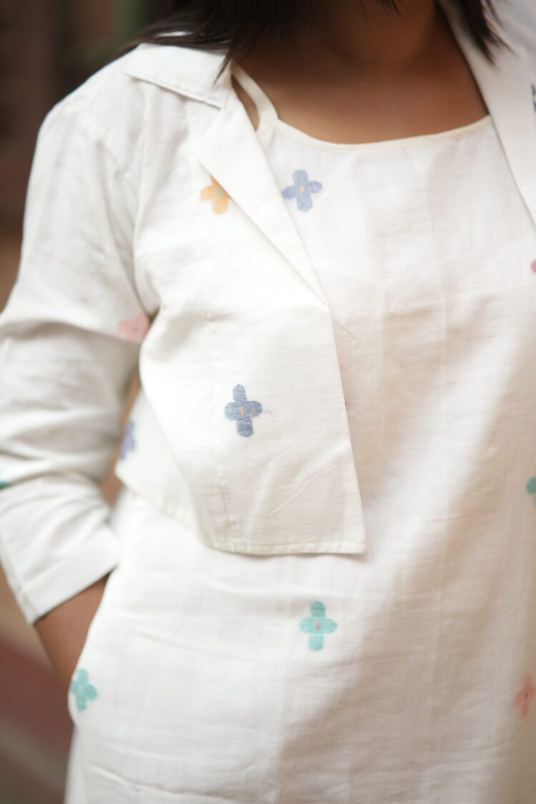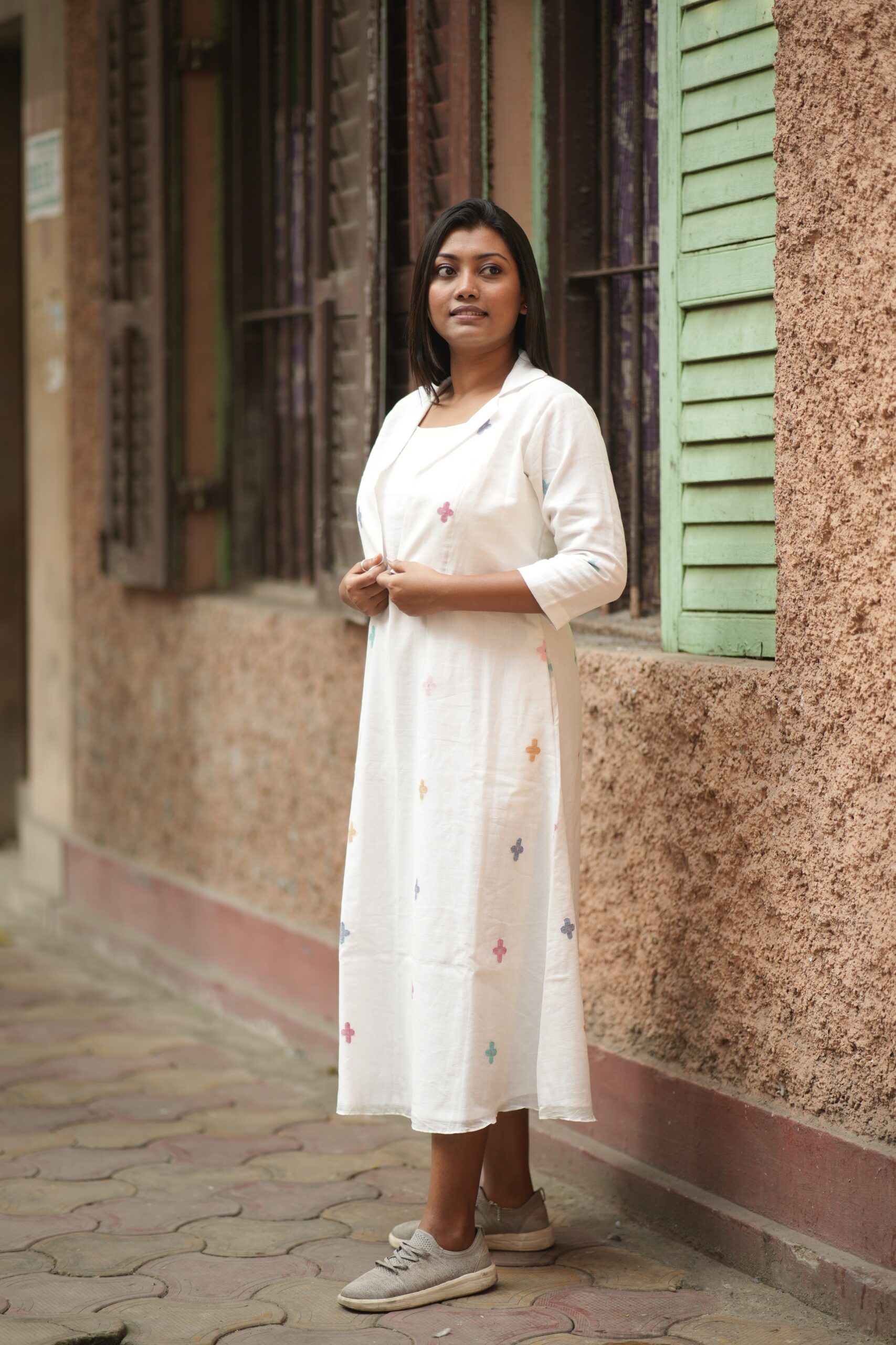 White multicolour floral handwoven jamdani dress comes with a noodle strap tunic and a coat collar short jacket. This dress has both side pocket and a comes with full mul lining.